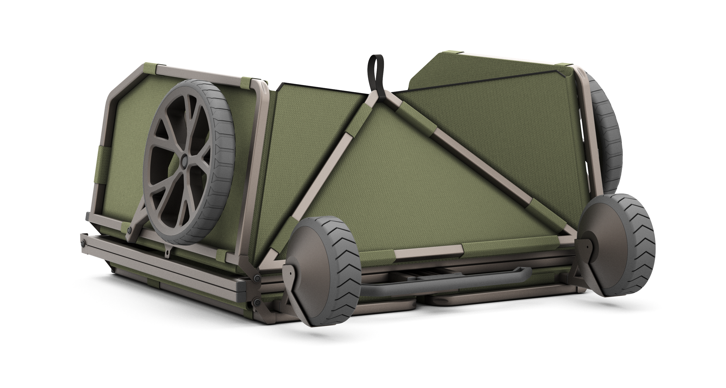 Tuck’s distinctive folding exoskeleton combines metal subframes with semi-rigid fabric panels. The geometric folding pattern provides strength across the entire chassis. While opening, the chassis locks into place with an over-center snap, providing haptic assurance to the user. Small Velcro pads ensure that the chassis stays open during operation. Removable center-dividers allow for organization and enable tuck to be halfway open, acting as a static storage bin in rugged terrains.