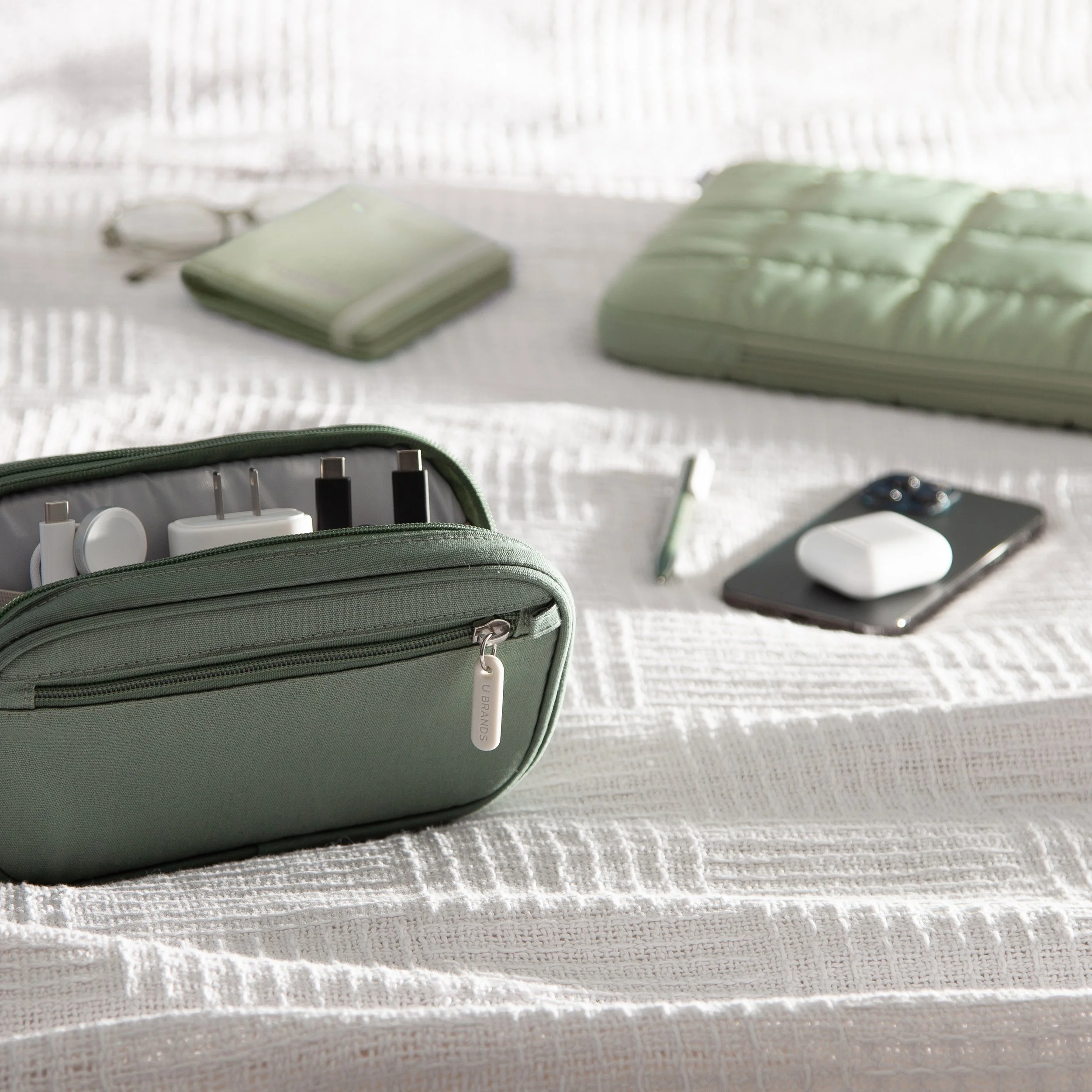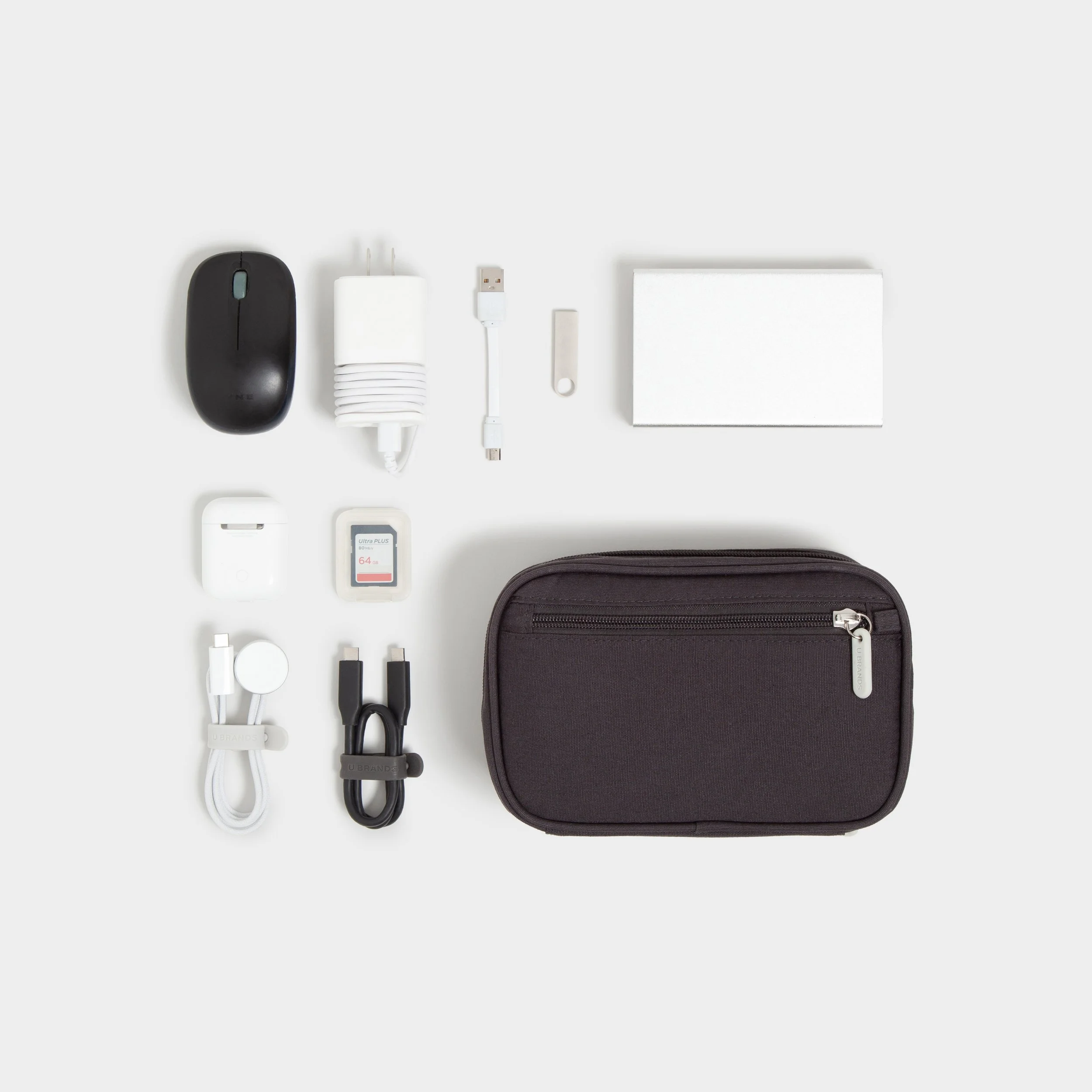 The Tech Pouch provides a catch-all solution for on-the-go tech essentials. Designed for transporting vital powered items, the pouch contains a variety of pockets and compartments for protected storage. A unique dual-zip design allows for easy access and organization. Elastic gussets allow the pouch to expand in order to store larger items. The pouch is constructed from durable waxed canvas, lined with padding for protection from drops and spills.